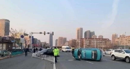 天津 一出租与轿车相撞,出租旋转120°侧翻