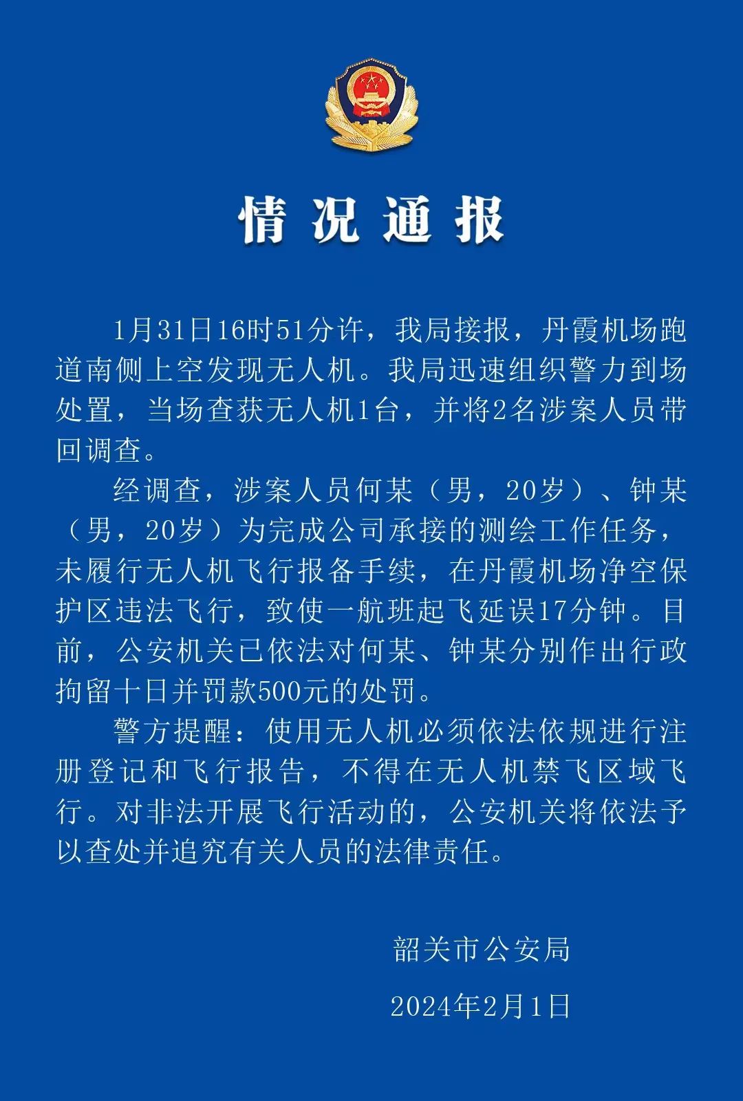 经调查,涉案人员何某(男,20岁)、钟某(男,20岁)为完成公司承接的测绘工作任务,未履行无人机飞行报备手续,在丹霞机场净空保护区违法飞行,致使一航班起飞延误17分钟。目前,公安机关已依法对何某、钟某分别作出行政拘留十日并罚款500元的处罚。